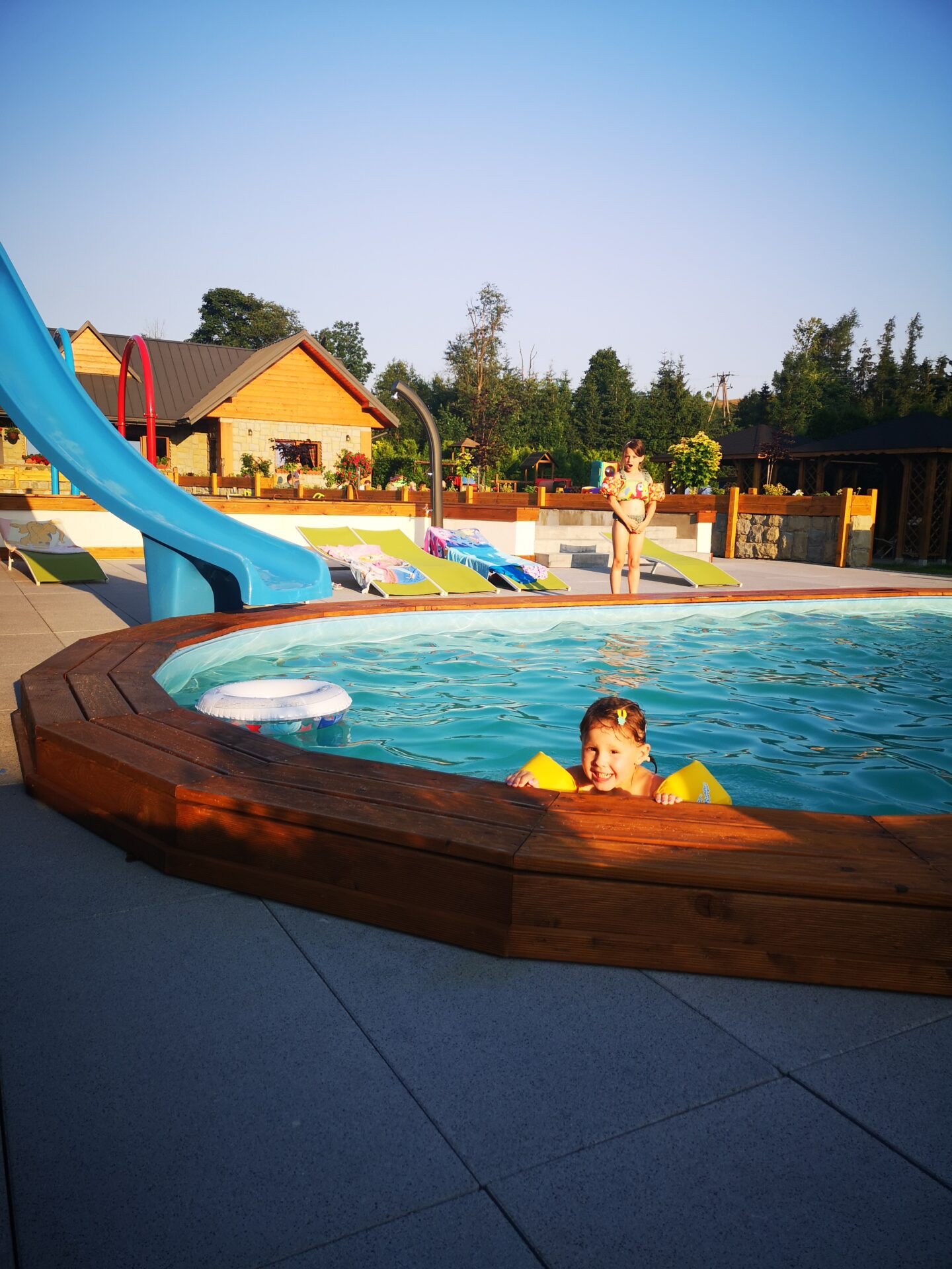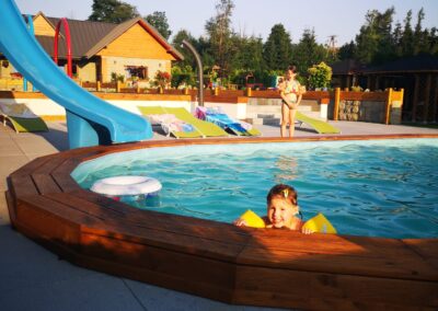 - otwarty basen o wymiarach 8,5 m x 4,5 m, głębokości 110 cm, z podgrzewaną wodą,