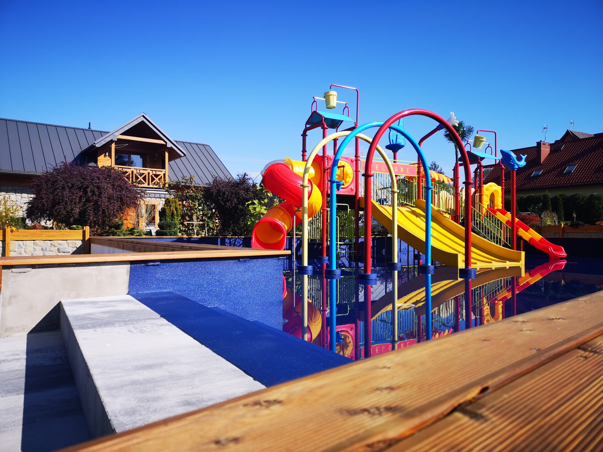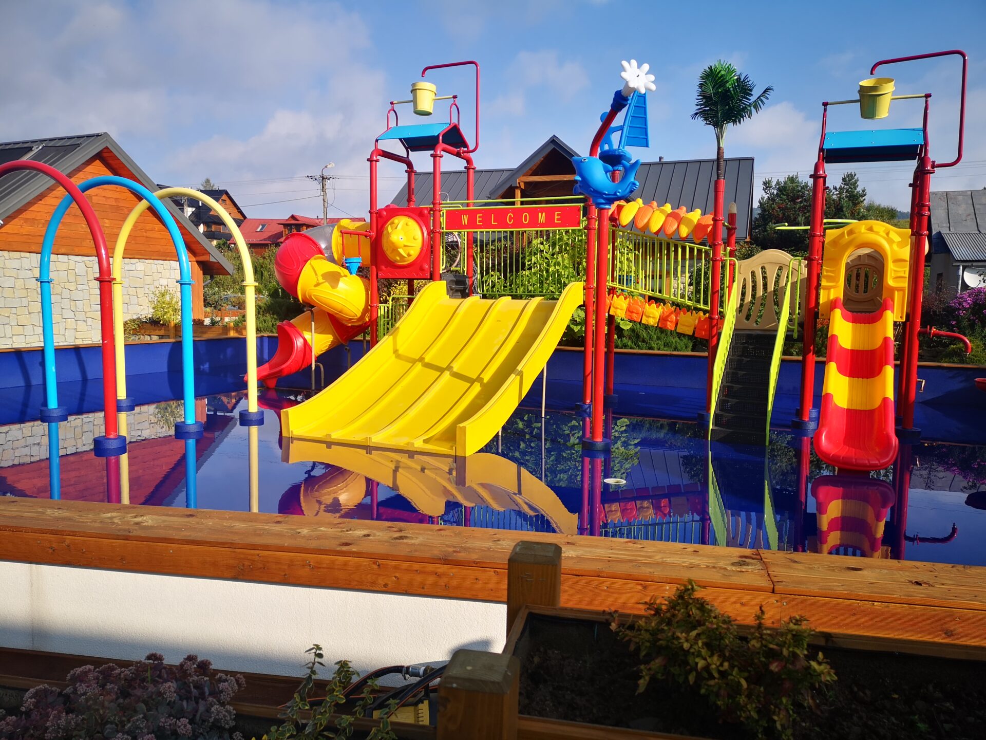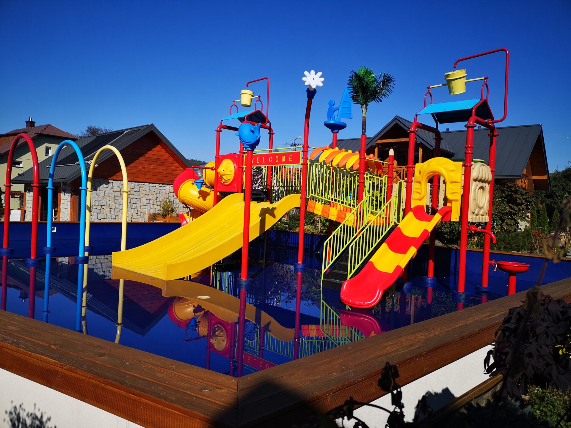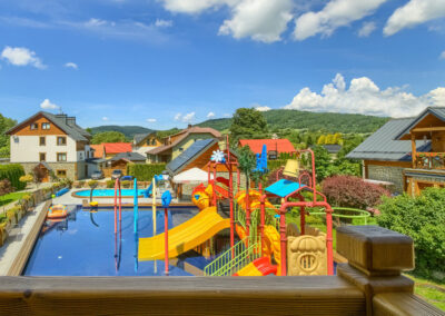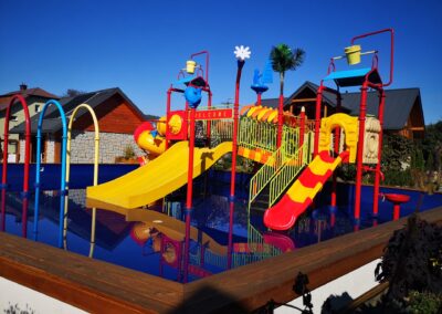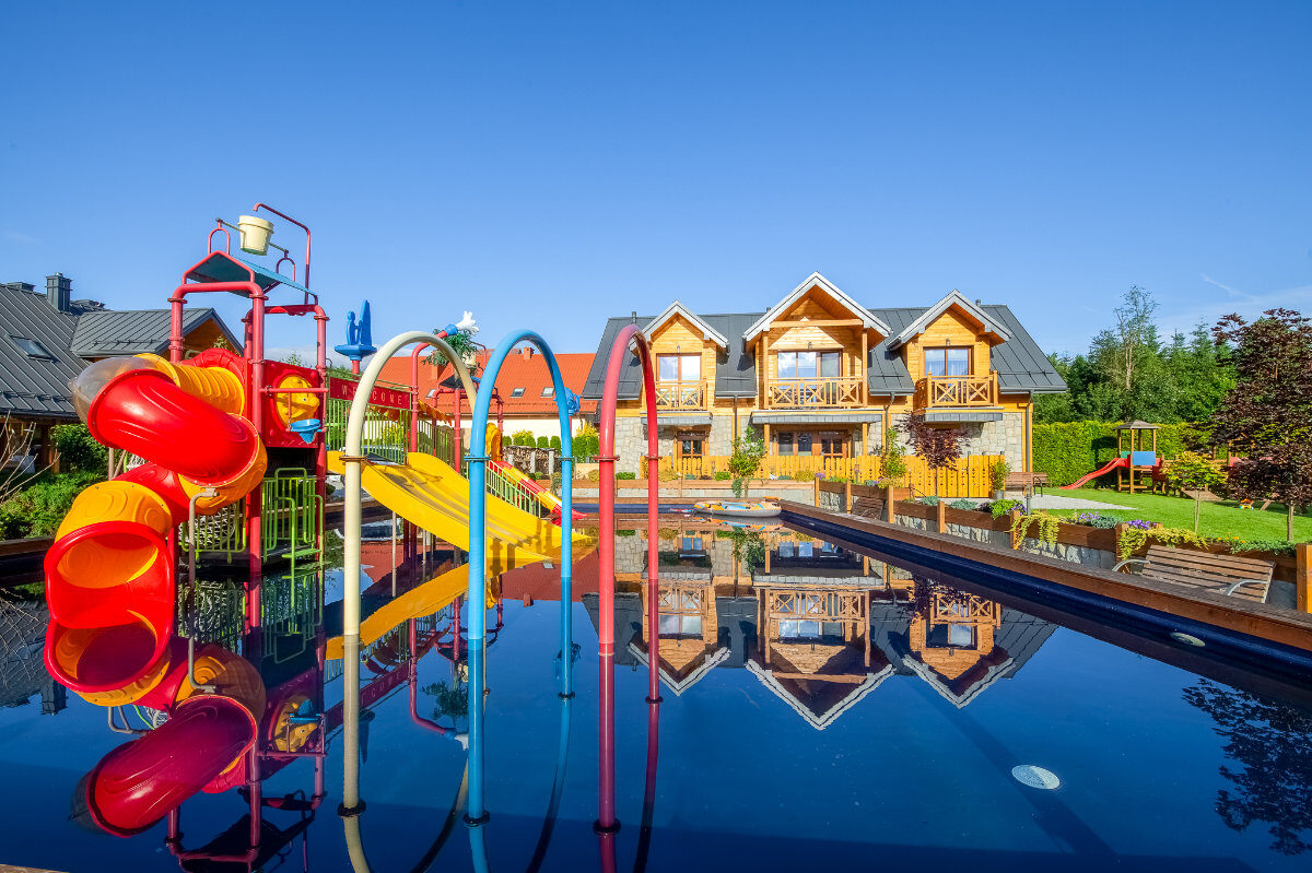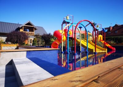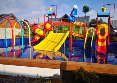 - wodny plac zabaw dla dzieci o powierzchni 180 m2 ze zjeżdżalniami, wspinaczkami, polewaczkami, natryskami. Woda o głębokości 30 cm, podgrzewana niezależnie od pogody,